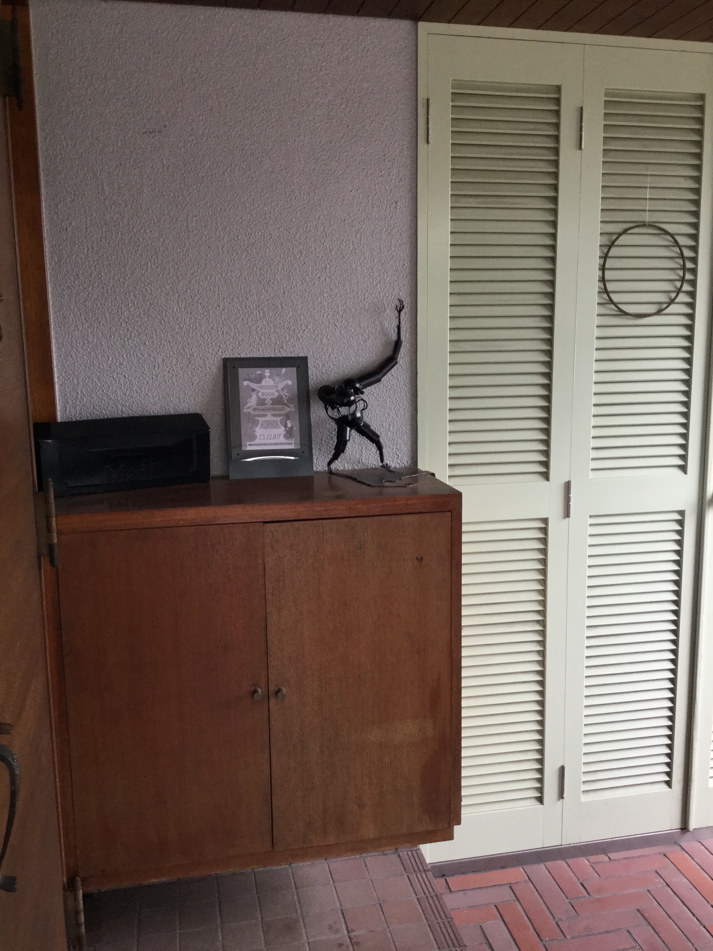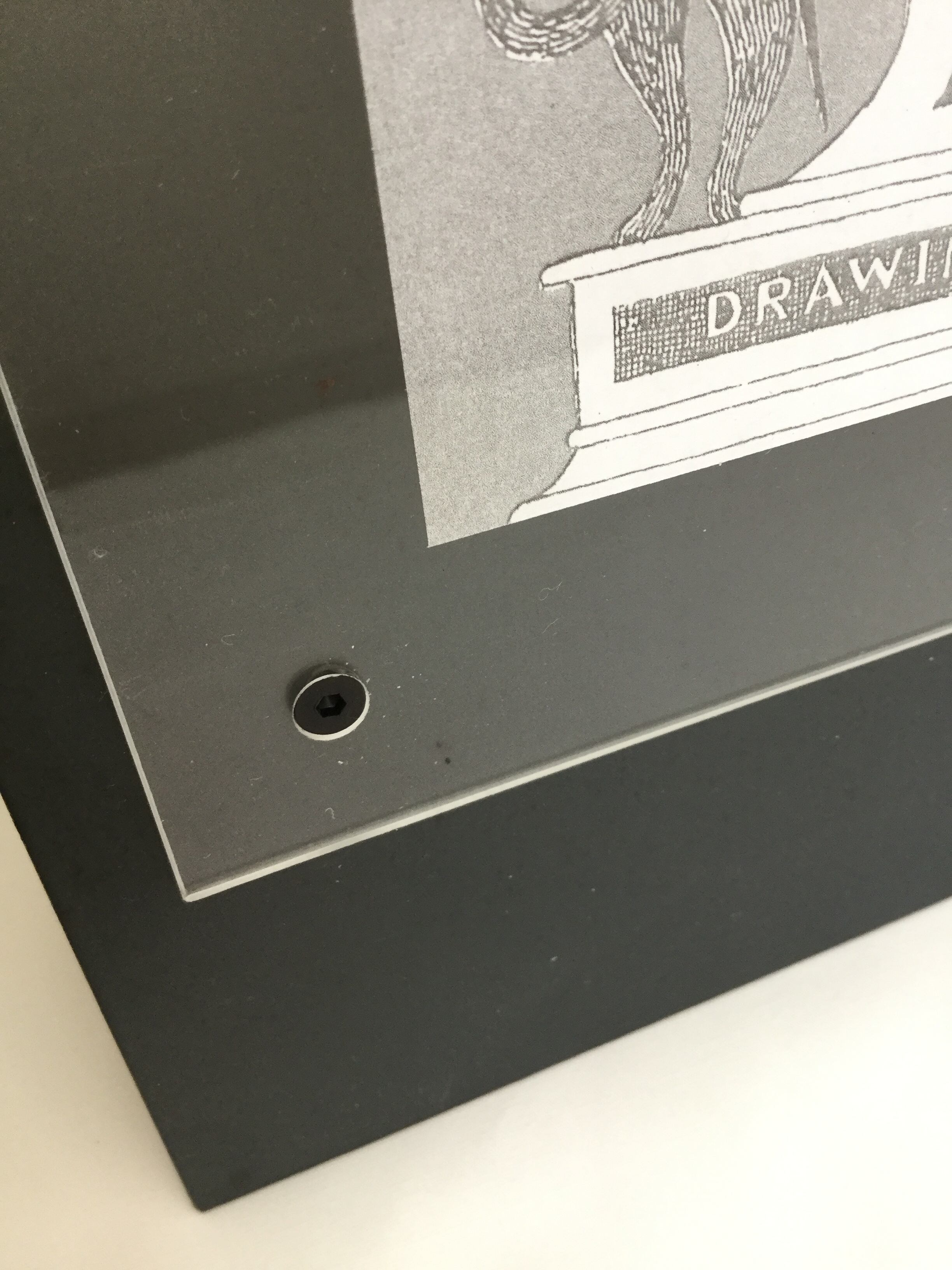 薄い鉄板にアクリルを小さいボルトで固定している額です。